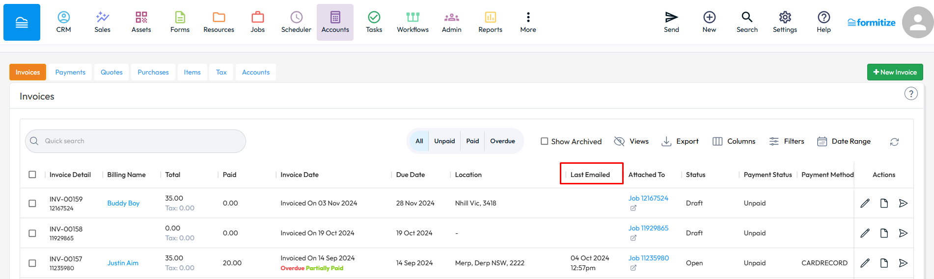 Select the Edit pen for the specific Invoice > Scroll down to the History / Notes. This will show all manual and automated emails that have been sent relating to this Invoice as well as edit history.