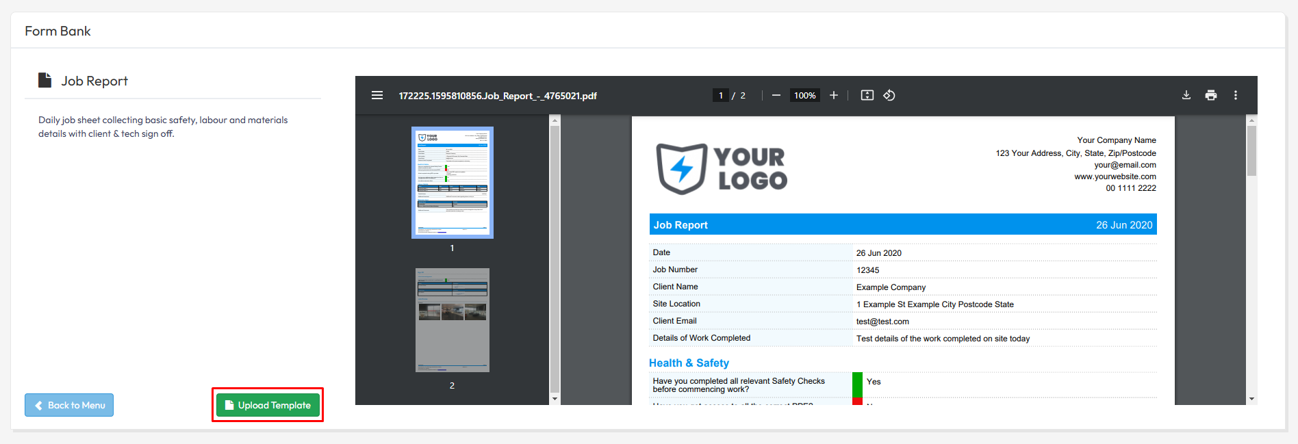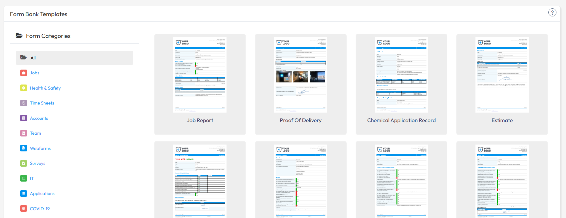 The Form Bank is also available with a range of forms that may suit your needs. In the Web Portal, go to Forms > Form Bank > select the form that you would like to add to your templates > Upload Template. From the form templates ( Forms > Existing Templates ) you will then be able to edit the form to further suit your needs.