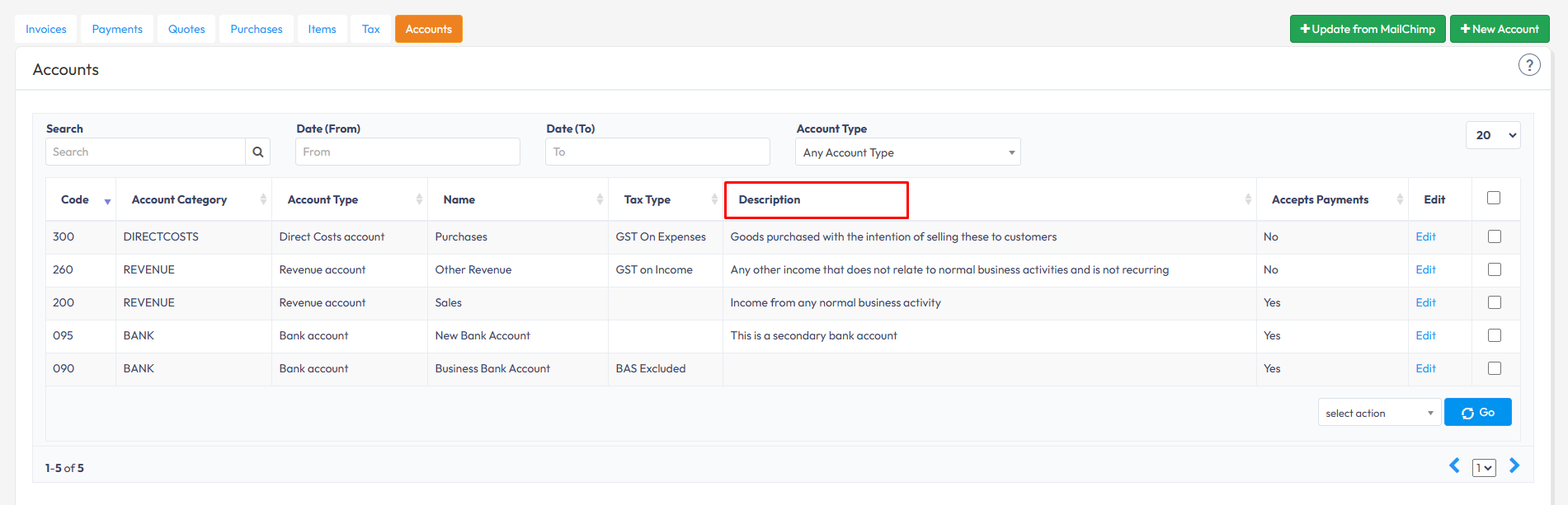 Account Description when creating account codes / types, is a description of how the account should be used.