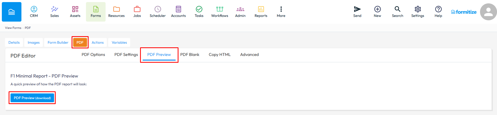 In the Web Portal go to Forms > View Form Templates > Edit Arrow for the template > PDF > PDF Preview. > PDF Preview (Download). You will then download a PDF example of the form template.