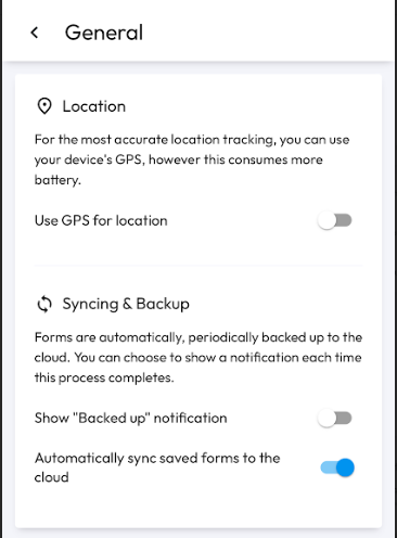 In the General settings, you'll find options regarding GPS location tracking and Sync / Backup settings.