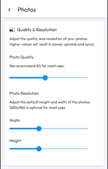 In Photos, you can select the Quality and Resolution for the photos that you take via the App.