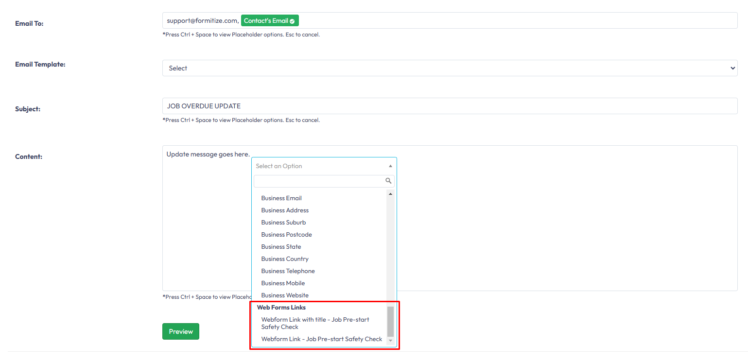 It is possible to create a job type template that can be utilised to send a Webform at any stage or time during a job by adding it to a Job Status Update.