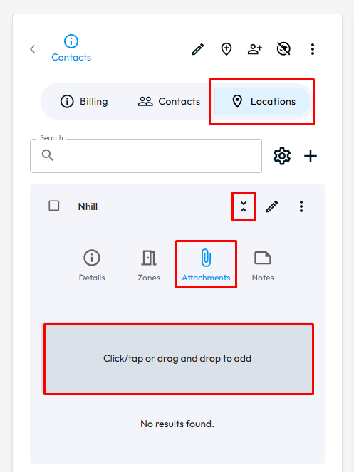 Go to CRM > All Contacts > Select edit arrow for the Contact > Select the Location button in the Contact Card and expand the information for that Location > Select Attachments > Click on the grey box or Drag and Drop the Document you want to upload to be attached to the location.
