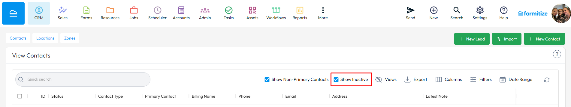 To search for an inactive Contact in your Web Portal go to CRM > All Contacts > Select the Show Inactive checkbox. It is unselected by default.