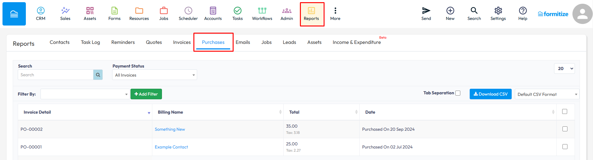 With Formitize's Reports function, you can easily create and review a CSV report that covers Purchase Order items. You can also filter or search by specific items, periods of time, payment status, and other information.