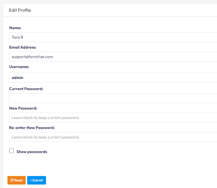 You will then be taken to you profile details settings, where you can change your profile name, username, email address, and password (Note: You will need to know what the original password was in order to change it).