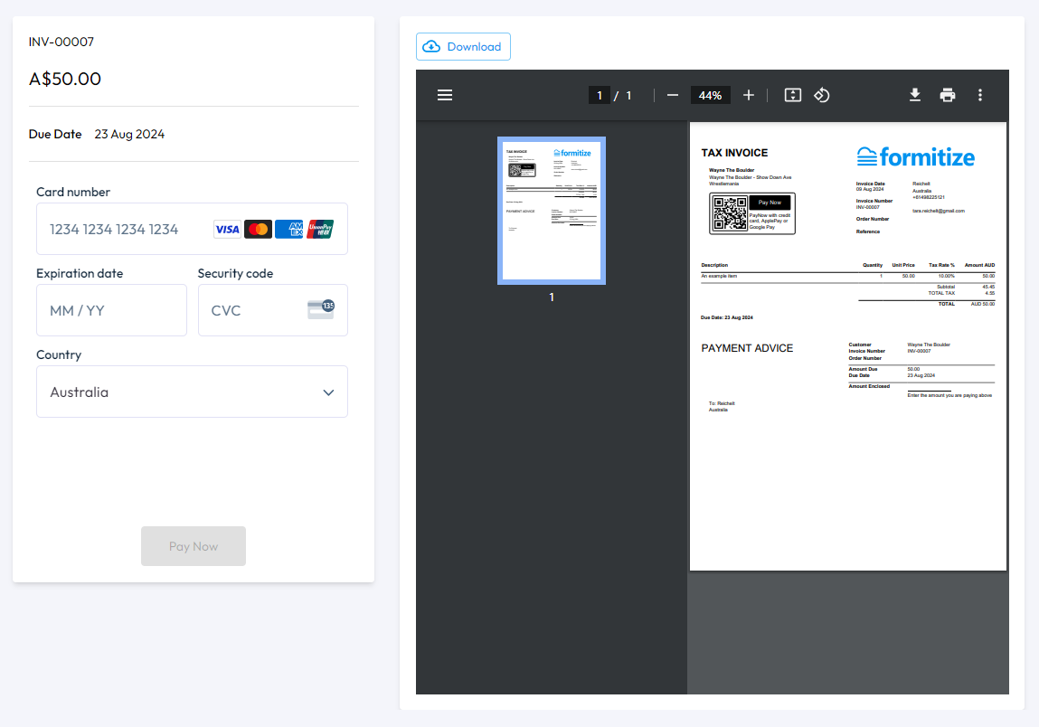 The invoice is downloadable / printable and can be paid through Formitize PayNow. If you do not have PayNow on your account, your clients will be able to pay as per the payment details listed on the Invoice.