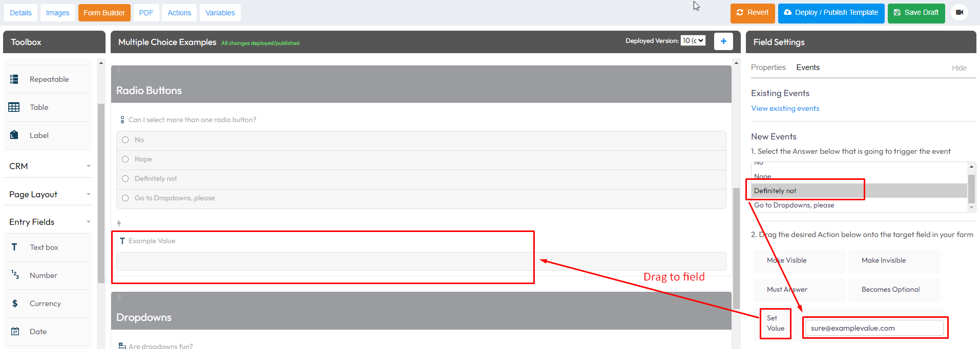 Select the answer you would like to create the Event for, then in the Set Value field, add the value that you would like to have appear automatically in a field. Once that is done, you can drag the Set Value window to the field where you would like the answer to be auto-populated.