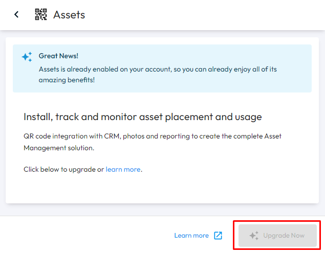 Select Upgrade Now to opt in for Assets Management and then start exploring the advantages of having the Assets module available on your Formitize account. . The button will be green if your account doesn't have the Assets Management Module enabled yet.