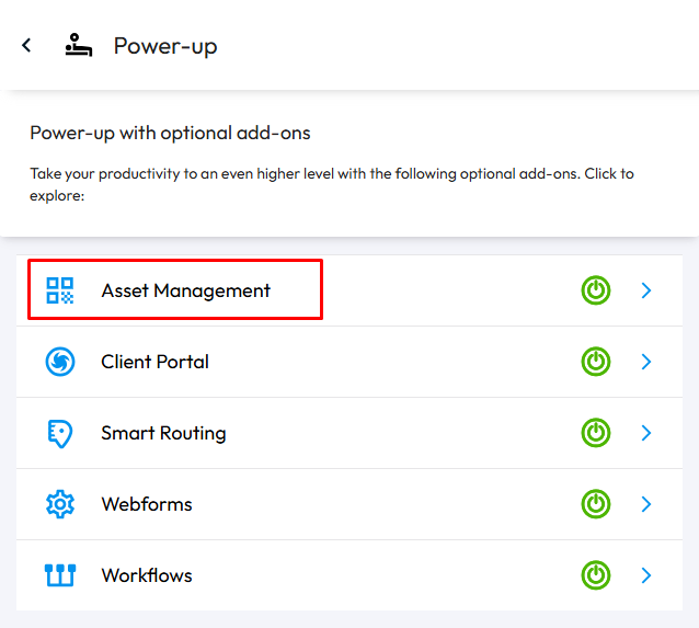 To Opt in to the Assets Module and experience management and integration of your Asset information with Formitize, you can select Power up option in the top menu and a drawer will pop out from the right side of the screen. Then select Asset Management from the list.