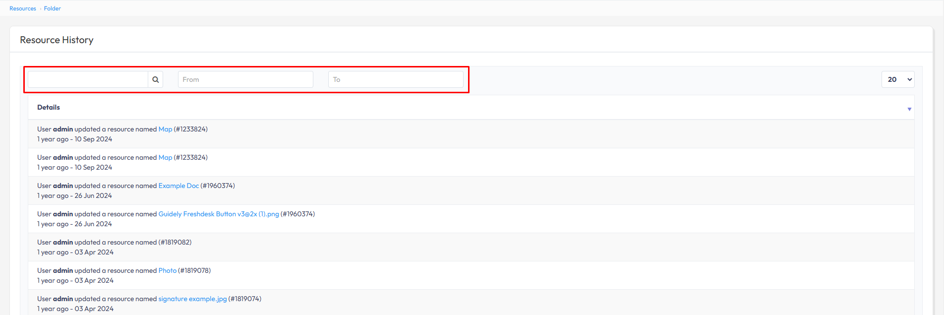 You will find a list of all changes made in the Resources, and can search for specific items and filter by dates to find out what happened to something.