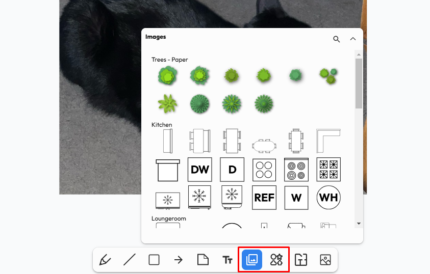 Inside the Mark up tool, you can find legend Images and Icons in the bottom menu. The Images option allows for map type images to add to an overhead map.